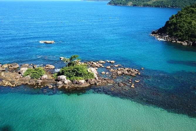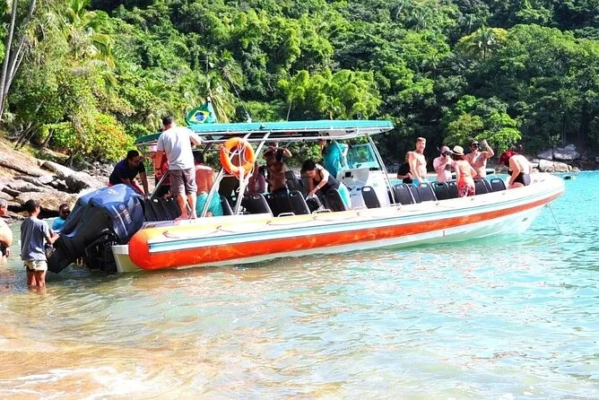 Recorre la costa de Ilhabela en lancha rápida con paradas para snorkel en Praia da Fome y Praia do Eustáquio antes de llegar a Praia dos Castelhanos para almorzar y nadar. Disfruta vistas de la ciudad, brisa marina, risas con tu guía y la selva atlántica salvaje a tu alrededor — un día que recordarás mucho después de secarte la piel.
