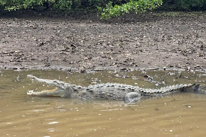 Nos adentramos más en el bosque de manglares, uno de los más grandes de Costa Rica. Los árboles formaban arcos nudosos sobre nuestras cabezas; a veces sus raíces parecían dedos que se hundían en el agua marrón. Hubo un momento en que un grupo de monos aulladores empezó a gritar — un rugido repentino que me hizo saltar. José sonrió y nos dijo que son mucho más ruidosos de lo que parecen. También vio un cocodrilo medio oculto cerca de la orilla. No esperaba sentir tanta calma al verlo flotar, con los ojos apenas asomando sobre el agua.