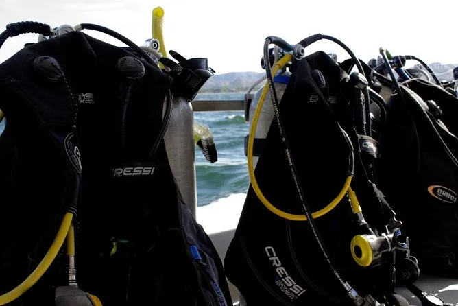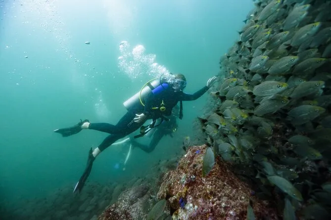 Tu día incluye todo el equipo de buceo preparado en el centro de Flamingo y la guía de un instructor local durante ambas inmersiones. Entre sesiones bajo el agua en Islas Catalina y North Island recibirás agua, té helado, fruta fresca y galletas antes de regresar a tierra al mediodía.