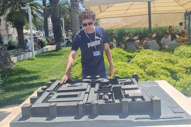 Es como aterrizar en el corazón de todo: la Riva llena de vida, el tintinear de las tazas de café, el aire del mar mezclado con ese aroma dulce de pan recién horneado. Nuestro guía, el profesor Marko (nos dijo que solo lo llamáramos Marko), nos llamó junto al modelo del palacio. Tenía una forma de hablar de Split que te hacía sentir que habías vivido allí toda la vida, aunque yo tropecé con las piedras irregulares nada más empezar. La ciudad te golpea con sus capas: muros romanos junto a letreros de neón, viejos discutiendo de fútbol en los bancos. No podía dejar de mirar hacia arriba las cuerdas con ropa y pensar: “Aquí realmente vive gente dentro de estos muros milenarios.”