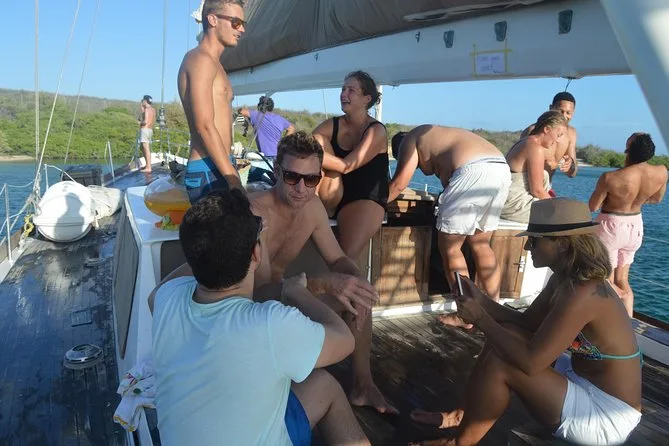 El almuerzo fue una barbacoa informal justo en la cubierta — pollo ahumado, verduras a la parrilla, y un ponche de ron que sabía más fuerte de lo que esperaba (¿quizá demasiado? Pero a nadie le importó). Alguien puso música desde el móvil y por un rato fuimos solo nosotros comiendo con las manos, pasando platos mientras el barco se mecía suavemente. No había horarios; Jairo preguntó si queríamos seguir hacia el oeste o simplemente dejarnos llevar un rato más. Una pareja de Ámsterdam decidió volver en taxi después para poder quedarse más tiempo en una de esas playas escondidas — parece que es una opción si la quieres.