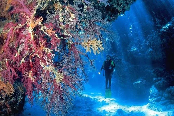 Pasarás un día completo explorando la playa Mahmya en la Isla Giftun: haciendo snorkel en arrecifes vibrantes a pocos pasos de la orilla, relajándote en arena suave, disfrutando de un almuerzo fresco de mariscos y contemplando las vistas del Mar Rojo. Es una diversión tranquila para todas las edades con guías expertos.