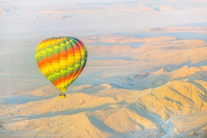 Vuela alto sobre Luxor al amanecer en un globo aerostático, contemplando sitios antiguos como el Valle de los Reyes y el Templo de Hatshepsut mientras la luz del día crece. Disfruta de recogida y regreso al hotel, relatos del piloto local, té caliente antes del despegue y esa mezcla única de nervios y asombro que queda para siempre.