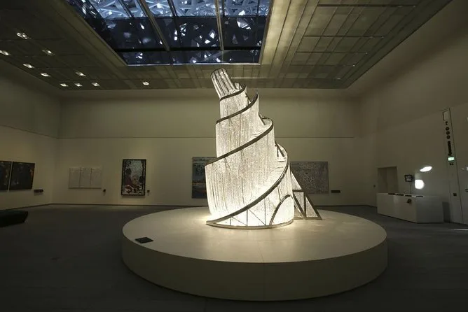 Después nos dirigimos al Louvre Abu Dhabi. La verdad, pensé que solo echaría un vistazo rápido (el arte moderno no es lo mío), pero Kareem empezó a contar historias sobre algunas piezas—como una escultura que sobrevivió a una tormenta de arena antes de llegar aquí. La luz dentro es extrañamente hermosa; se filtra a través de paneles calados y suaviza todo a su paso. Había niños dibujando en taburetes pequeños y una pareja mayor discutía bajito sobre qué pintura “valía realmente la pena”. Me encantó ese ambiente.