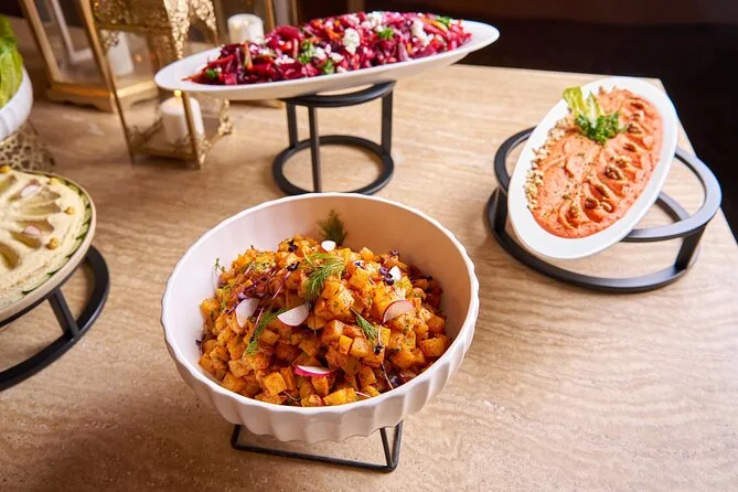 Un buffet BBQ con carnes a la parrilla, ensaladas, opciones vegetarianas, delicias árabes y refrescos ilimitados.