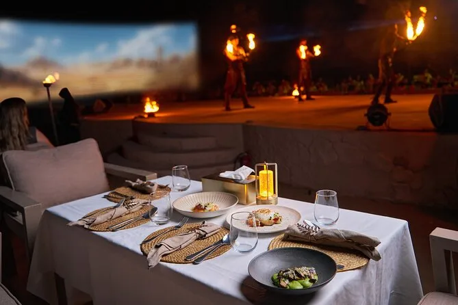 El campamento parecía una fiesta en el patio de alguien — dátiles y café esperando en la entrada, gente charlando en grupos bajo faroles. Había camellos bebés (sí, en serio) y un souq donde un anciano intentó enseñarme a decir “gracias” en árabe. Li se rió cuando lo intenté repetir — seguro lo dije fatal. La cena fue un gran buffet BBQ con carnes a la parrilla y ensaladas; no paraba de volver por más hummus. Cuando oscureció empezaron los shows: bailarinas con faldas giratorias, artistas con fuego que dejaron a todos boquiabiertos, incluso un cantante que nos hizo aplaudir sin saber muy bien por qué.