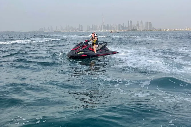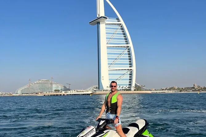 Tu aventura en jet ski de 45 minutos en Dubai incluye agua embotellada para mantenerte fresco, gastos de aparcamiento cubiertos para que no te preocupes al llegar, un guía local amable que toma fotos y videos junto al Burj Al Arab (todo incluido), y tiempo para cambiar de conductor mientras aceleras hacia esas vistas icónicas antes de regresar juntos a la orilla.