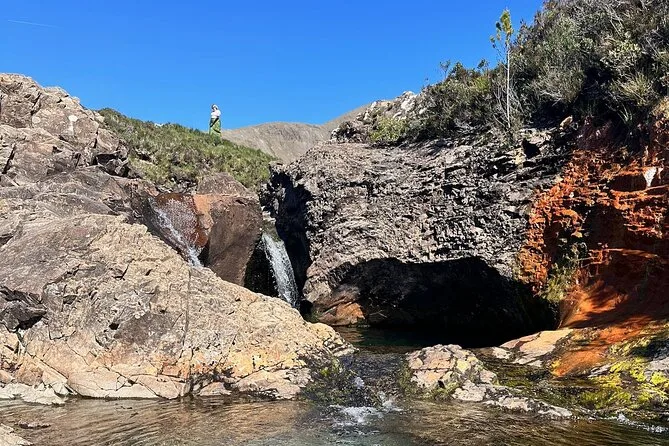 Después llegó Kilt Rock, con un viento tan fuerte que la cascada lanzaba el agua hacia arriba en vez de caer. Jamie dijo que pasa más de lo que la gente cree. Los acantilados realmente parecen pliegues de falda si haces un poco de esfuerzo (o tal vez yo quería que fuera así). Luego apareció el Storr, imponente, como un diente negro contra el cielo gris, y por fin las Fairy Pools. La caminata duró unos 20 minutos; no es difícil, aunque hay tramos rocosos. El agua era tan cristalina que se veían todas las piedras bajo mis botas. Algunos metieron las manos (¡heladas!), otros se sentaron en silencio con las montañas Cuillin de fondo. No esperaba sentirme tan pequeño y en paz al mismo tiempo.