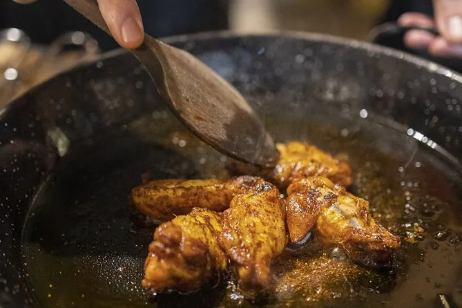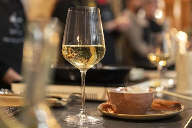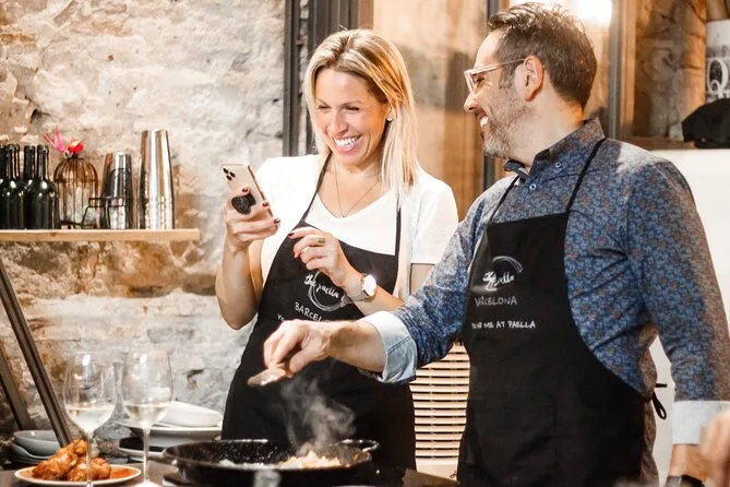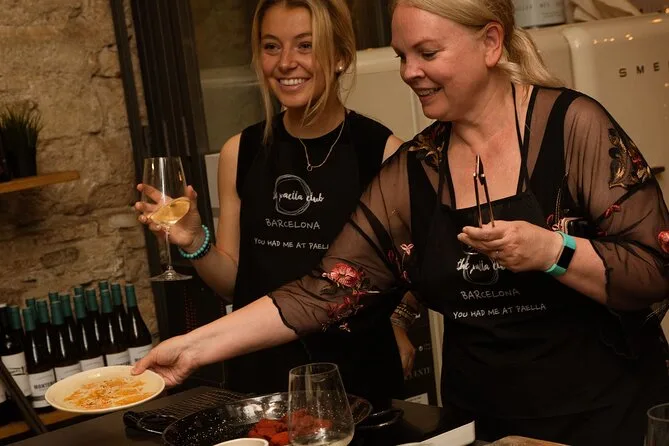 Tu noche comienza con un vaso de cava de bienvenida en El Raval, seguido de una clase práctica de paella con un chef profesional, con todos los utensilios e ingredientes en tu estación personal. Incluye agua embotellada, degustación de vinos españoles durante la cena de cuatro platos (pan tomàquet, gazpacho, tu propia paella y postre), además de opciones vegetarianas o veganas si las necesitas. Todo esto acompañado de buena charla en la mesa compartida antes de salir a disfrutar la noche barcelonesa.