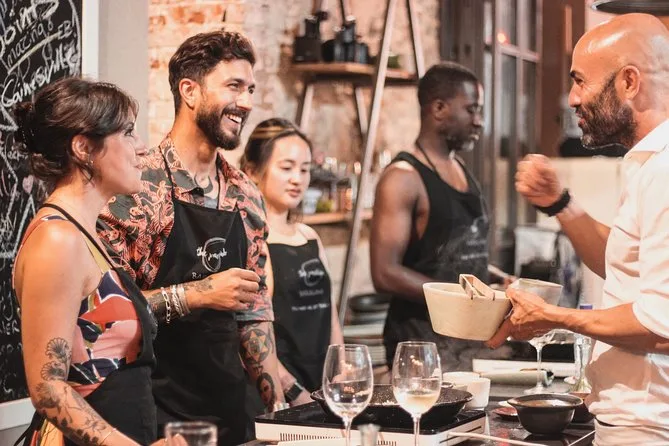 Brinda con cava al conocer a tu chef en El Raval, aprende a hacer paella con tus propias manos (y quizás falles con el pan tomàquet, pero nadie se enfada). Prueba gazpacho, ríe con nuevos amigos y disfruta de vino catalán con tu cena de cuatro platos. Una experiencia cálida, divertida y llena de momentos que no olvidarás.