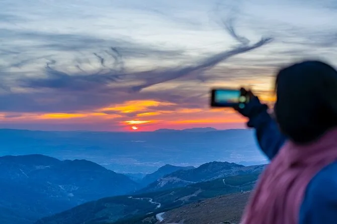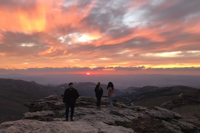 Tu día incluye viaje en grupo reducido en un Mercedes Sprinter 4x4 con recogida en Granada, relatos y guía por senderos antiguos, una bebida en un refugio panorámico a 2500 metros, y mucho tiempo para detenerte o pasear antes de regresar juntos.