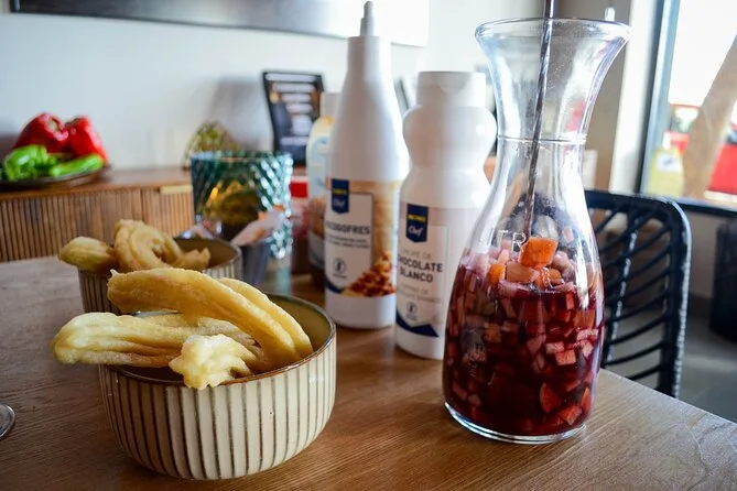 Terminamos con churros para mojar en chocolate — no tan crujientes como esperaba, pero perfectos después de tanta comida. Al salir a la calle con mi delantal nuevo bajo el brazo, olí un poco de ajo en mis manos y pensé en lo mucho que Málaga se sentía más auténtica después de esas horas. Aunque todavía no sé decir “boquerones” bien.