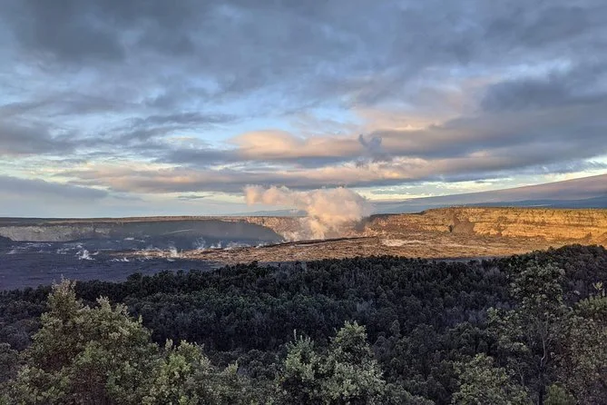 Tu día incluye recogida en hoteles de Kona o Waikoloa, entrada al Parque Nacional de los Volcanes de Hawai con guía durante todo el recorrido por Chain of Craters Road, acceso exclusivo y degustación en una finca de café Kona 100% (con muchas muestras), snacks y bebidas en el camino—incluyendo agua—y almuerzo con vistas a la caldera del Kilauea antes de regresar por Saddle Road con paradas para fotos o caminatas cortas según el clima.
