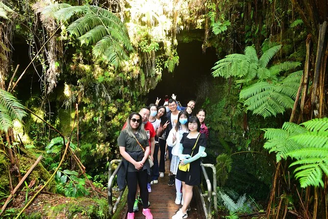La excursión dura todo el día e incluye paradas en una finca de café Kona, la playa de arena negra de Punaluʻu, el Parque Nacional de los Volcanes, Rainbow Falls cerca de Hilo y el regreso por Saddle Road.