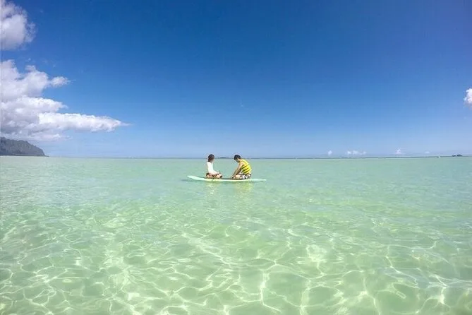 Tu día incluye un corto paseo en bote desde Heʻeia Kea Boat Harbor hasta Kaneohe Sandbar con todo el equipo de snorkel (máscara y boquilla), paddle boards y flotadores para adultos y niños (cantidad limitada), chalecos salvavidas para seguridad, además de snacks como spam musubi y papas fritas junto con refrescos, todo bajo la amable guía de la tripulación local antes de regresar cómodamente.
