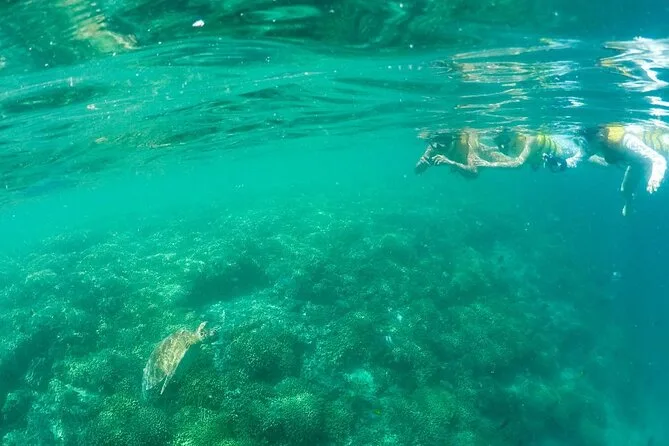 Cuando anclamos, todo se calmó. Algunos se lanzaron directo al paddle surf (yo dudé un poco, para ser sincero), mientras otros se sentaron en el borde del bote con los pies colgando. Nuestra guía, Li, nos enseñó a usar el equipo de snorkel y nos señaló dónde suelen estar las tortugas. Intenté decir “honu” (tortuga en hawaiano) y Li se rió — seguro lo dije mal. El agua estaba tan clara y cálida que se podían ver los peces nadando antes incluso de meter la cara.