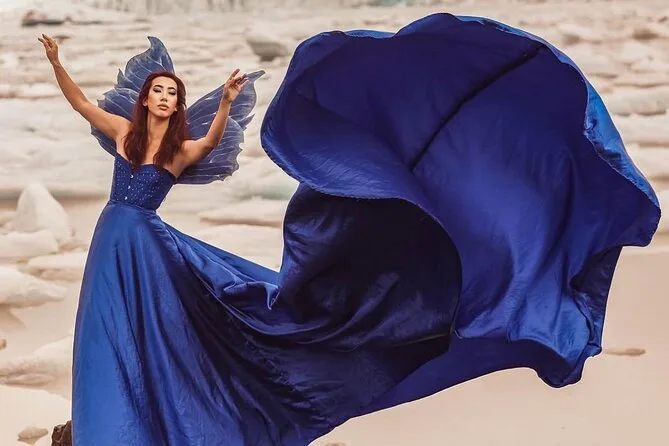 Lo primero que recuerdo es el color: mi vestido era un azul intenso que casi se confundía con el mar. Nunca había llevado algo así. Nuestra fotógrafa, Malia, me lo entregó con una sonrisa y dijo: “Confía en mí, se verá mágico con el viento.” Me reí un poco porque no soy muy elegante, pero ella me enseñó a sujetar la tela justo para que atrapara la brisa. La arena estaba tibia bajo mis pies y se sentía un leve aroma a plumeria en el aire; seguro alguien cerca llevaba esa fragancia.