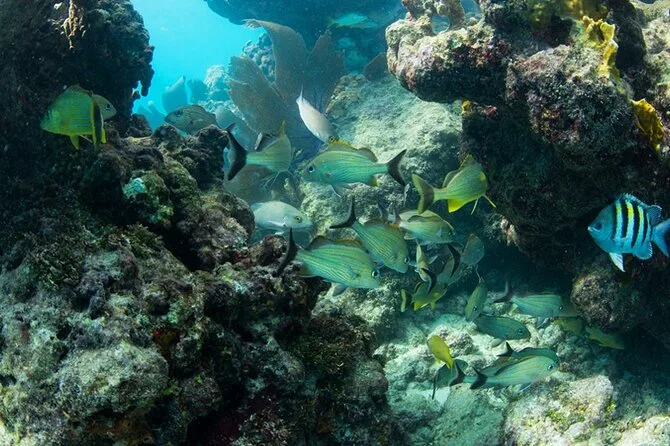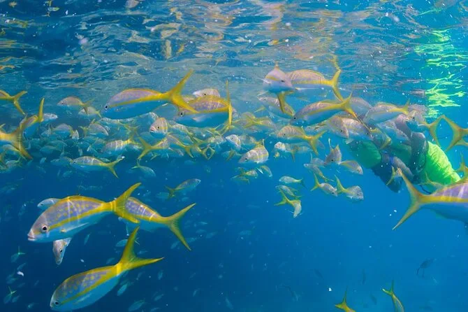 ¿Lo mejor? El paseo en barco hacia el arrecife. Subimos justo después de almorzar, con música de fondo, mientras la tripulación repartía el equipo de snorkel y explicaba las normas de seguridad. El agua estaba más clara de lo que esperaba, casi como cristal. Al meterme, bancos de pargos amarillos nadaban a mi lado y el coral parecía sacado de una película de Jacques Cousteau: morados, naranjas y hasta algunos corales cerebro asomando. Después de nadar un rato, me recosté de espaldas con un vaso de ponche de ron (el bar abierto es real), disfrutando del sol y la brisa marina. Eso sí, no hay comida a bordo, así que come antes de subir.