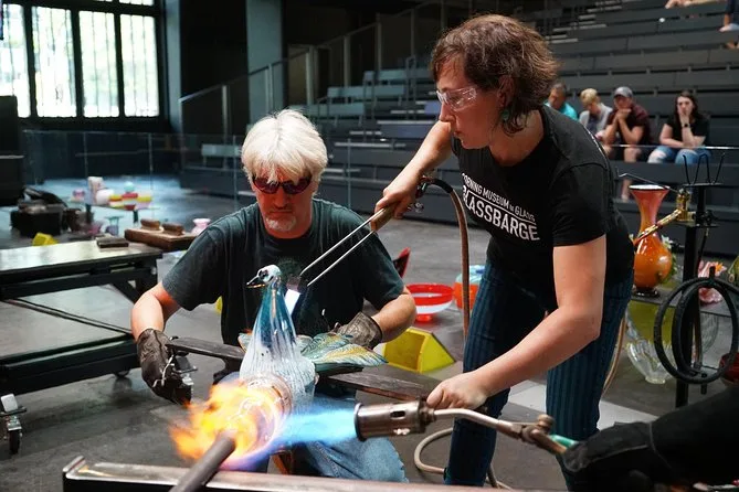 Tu visita incluye entrada para dos días consecutivos al Museo del Vidrio de Corning con acceso a todas las galerías y demostraciones en vivo; si te animas, puedes apuntarte a talleres prácticos para crear tu propio vidrio por un coste adicional, después de ver a los artistas en acción.