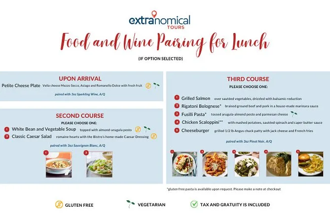Incluye un almuerzo estándar en Sonoma Plaza; puedes mejorar a un menú de tres tiempos con maridaje de vinos en un restaurante local.