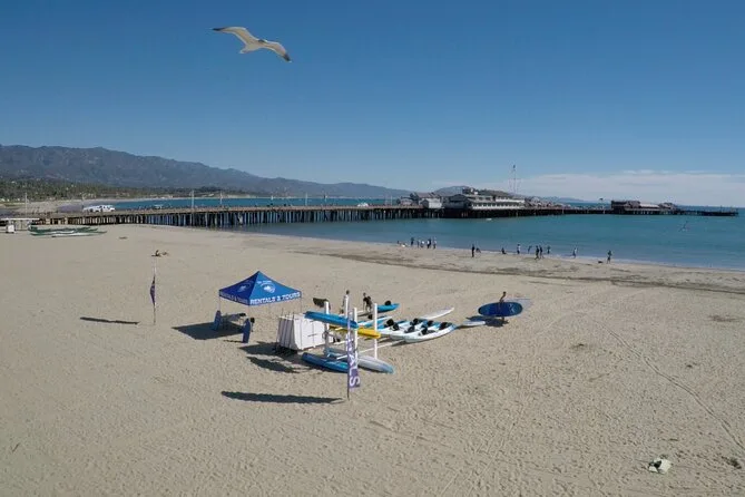 Te encuentras con el guía en West Beach, frente al Hotel Harbor View Inn (28 W Cabrillo Blvd). Busca las banderas azules cerca del cobertizo de equipo.