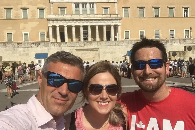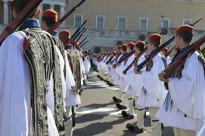 Después, zigzagueamos frente al Arco de Adriano y paramos en el Templo de Zeus Olímpico — esas columnas son impresionantemente altas de cerca. Intenté imaginar cómo sería con todas sus estatuas, pero mi mente se perdía en lo silencioso que se sentía ese lugar, a pesar de ser tan concurrido. Luego llegamos a la Plaza Sintagma, donde vimos el cambio de guardia de los Evzones en la Tumba del Soldado Desconocido. Sus zapatos tienen unos pompones enormes; no esperaba que ese detalle me emocionara tanto ni me resultara tan reconfortante. Yannis nos contó que su abuelo lo traía aquí los domingos — se rió recordando cómo intentaba imitar su marcha.