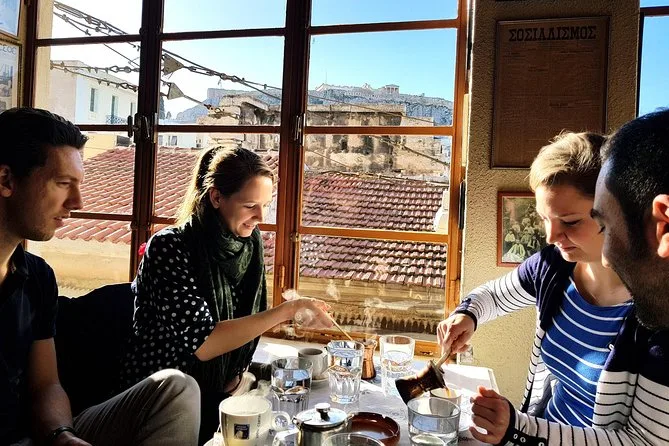 Paramos a tomar café griego en un lugar tan pequeño que si parpadeabas, te lo perdías. El café era espeso y casi lodoso en el fondo; María nos dijo que lo dejáramos reposar antes de beber o “te tocará un sorbo con arena”. Se rió cuando casi me pasa igual. Después llegaron más degustaciones — embutidos salados, aceitunas con sabor intenso, loukoumades bañados en miel que me dejaron los dedos pegajosos pero felices, y hasta platos de mezze con cosas que nunca había visto. El tour nos llevó por Psiri, donde el arte callejero sube por viejas paredes y todos parecen conocerse por su nombre.
