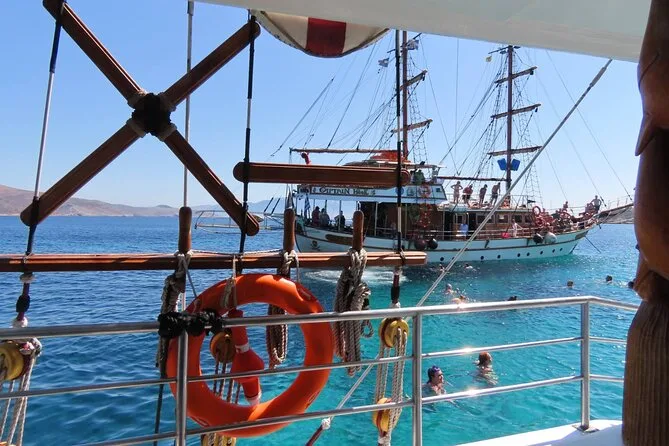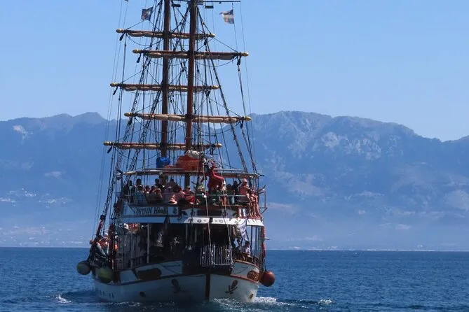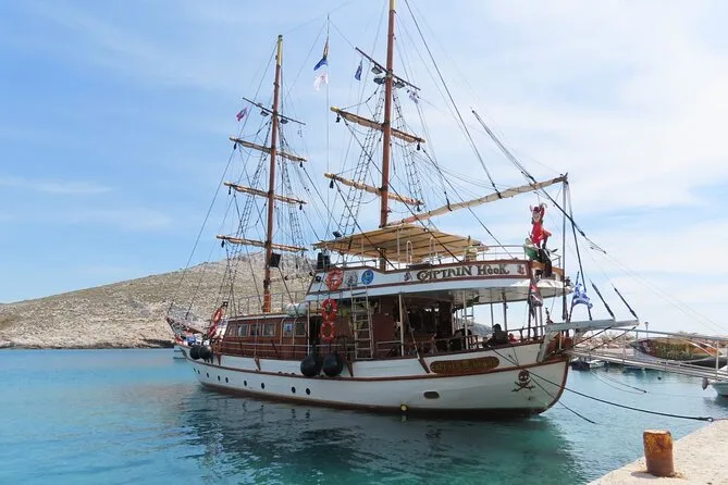 Tu día incluye subir al velero de madera del Capitán Garfio en el puerto de Kos con WiFi y baño a bordo; audioguía personalizada en tu móvil; paradas para nadar en Platy y Pserimos; tiempo en tierra en el pueblo de Vathy en Kalymnos para probar miel y zumo de naranja; además de un almuerzo griego recién hecho servido a bordo (con opciones vegetarianas o veganas si se avisa antes). Las bebidas son aparte—solo pide en el bar cuando quieras.