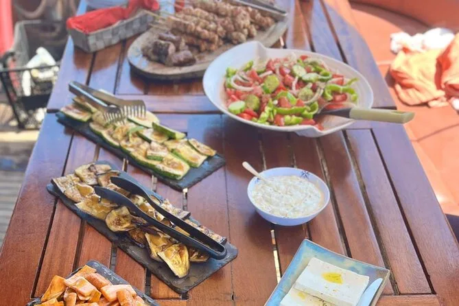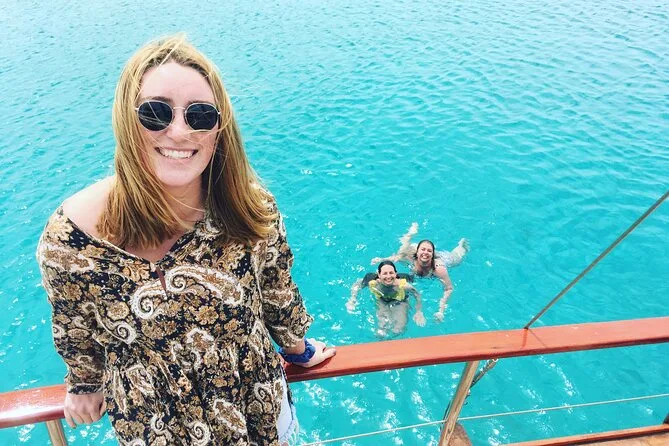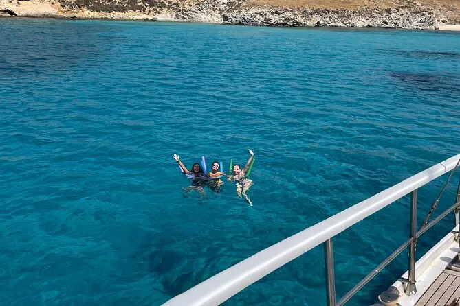 Tu día incluye navegación desde Mykonos con un acompañante local a bordo, uso de equipo de snorkel para la parada en Rhenia, seguro personal durante todo el viaje, acceso a WiFi si quieres (aunque casi no usé el móvil), además de café, té, agua, refrescos, vino blanco/tinto y cerveza durante el almuerzo — que se cocina al momento en la parrilla de la cubierta con muchas opciones vegetarianas. La recogida en hotel y tours guiados en Delos pueden reservarse antes por un coste extra.