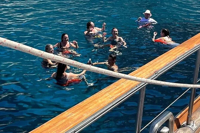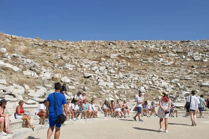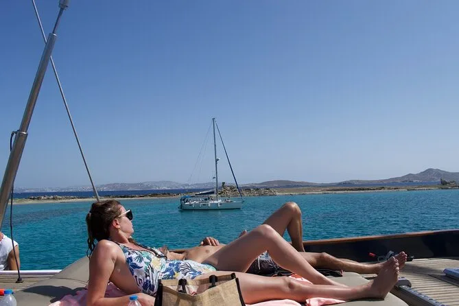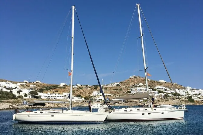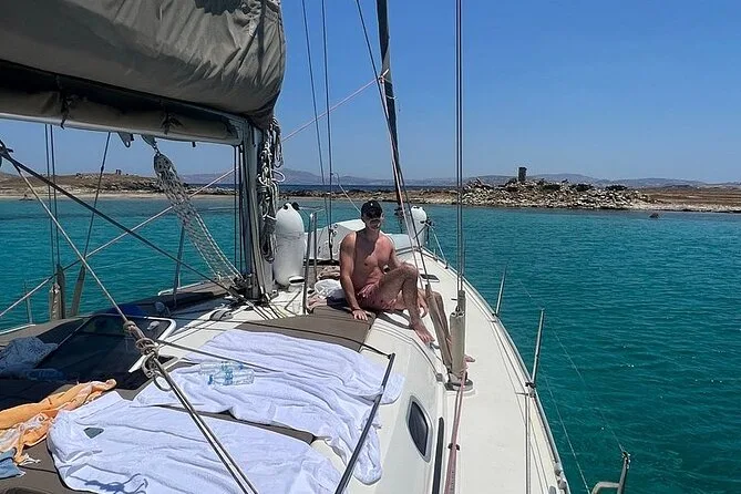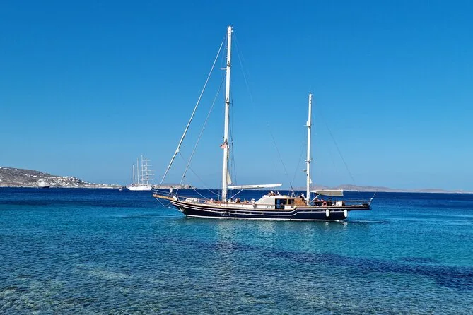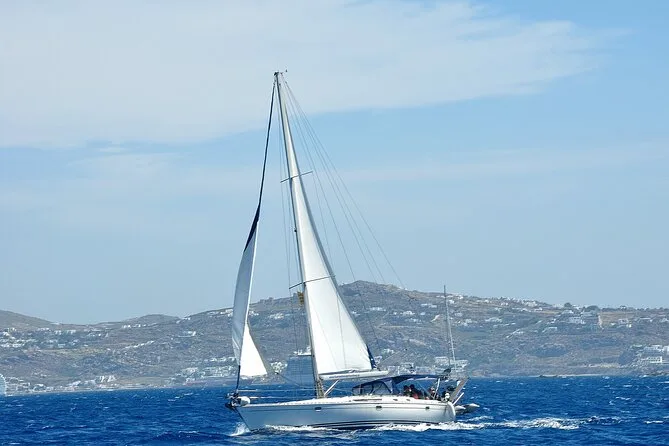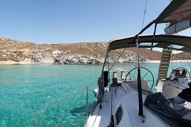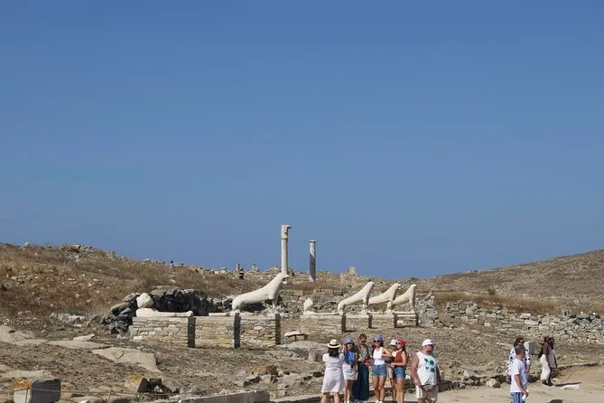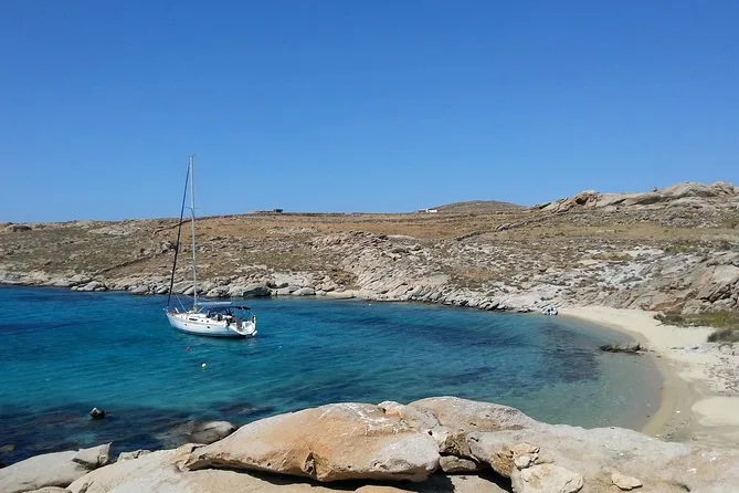 Tu día incluye recogida opcional en hotel si se acuerda tras reservar, seis horas en un yate con tripulación y todo el equipo de seguridad, uso gratuito de equipo de snorkel en la isla Rhenia, almuerzo mediterráneo recién preparado con fruta local acompañado de vino blanco o rosado de la casa y refrescos, tour guiado por las ruinas de Delos con guía autorizado en inglés (entrada no incluida), agua embotellada y café o té instantáneo durante el viaje, WiFi gratis a bordo para mantenerte conectado—y termina con un brindis de despedida antes de volver al puerto de Mykonos.