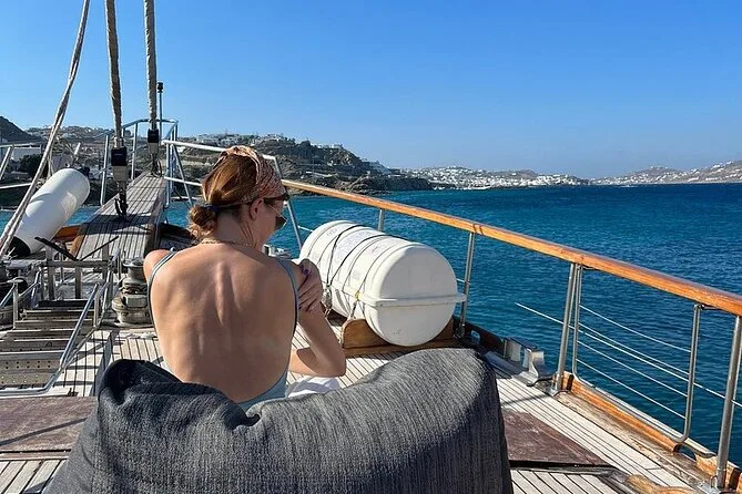 Me sigo acordando de ese último brindis en el barco — un trago rápido de algo local (ni idea qué era), todos chocando copas en un mezcla torpe de inglés, griego y español. De regreso a Mykonos, con el pelo lleno de sal, la piel tibia por el sol y el vino… parecía que habíamos robado un día de otro lugar.