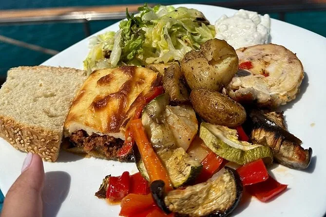 Sí, se sirve un almuerzo con sabores griegos a bordo junto con vino de la casa y refrescos.