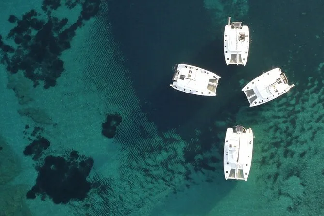 Tu día en catamarán por Santorini comienza con un café mientras conoces gente en cubierta. Nada o haz snorkel en calas tranquilas y luego comparte un almuerzo griego tradicional con vino y cerveza local a bordo. Cada brisa salada y risa con raki te harán sentir la magia de estas islas.