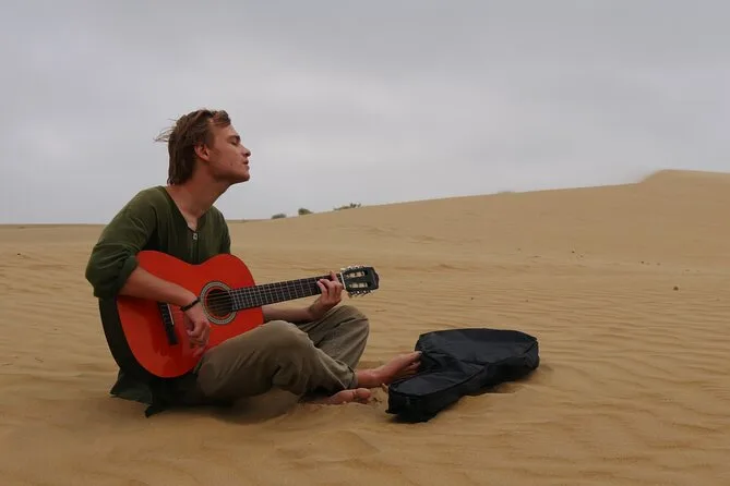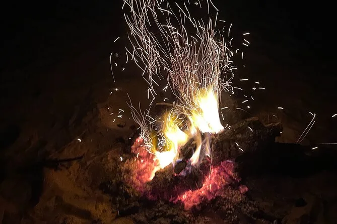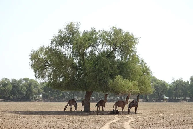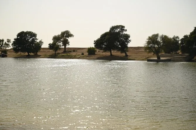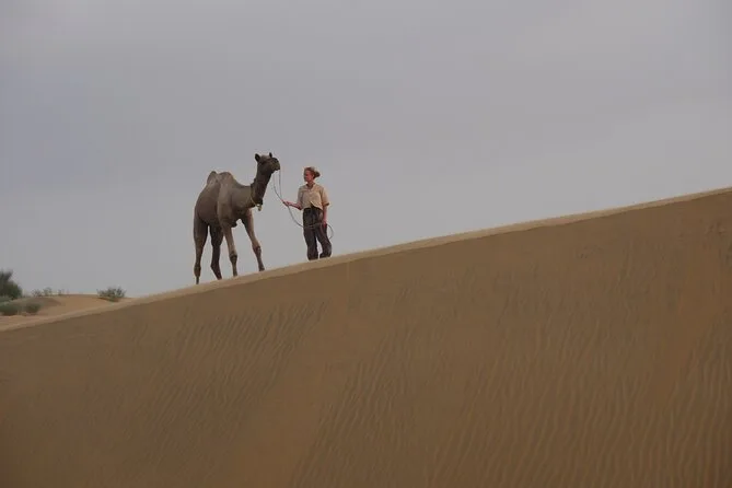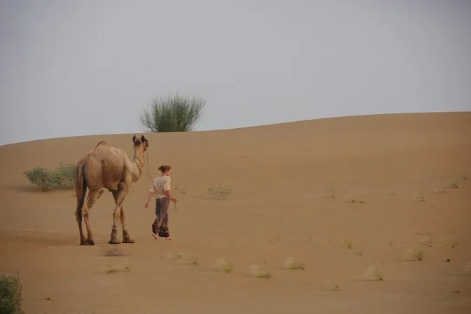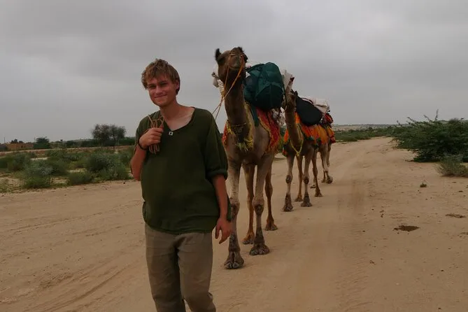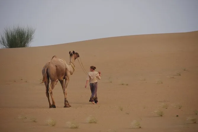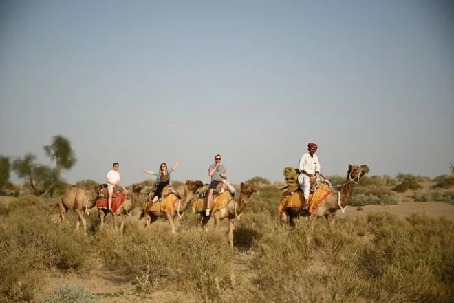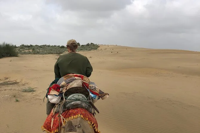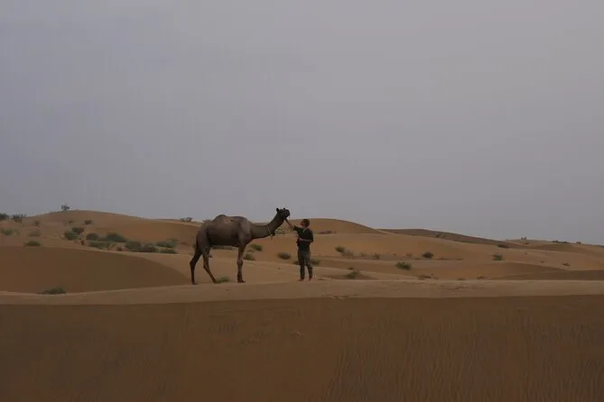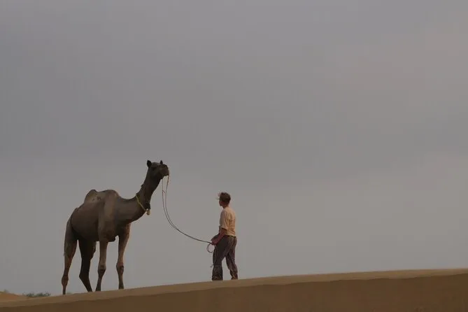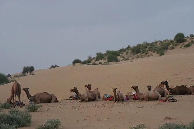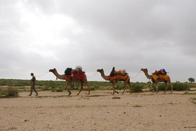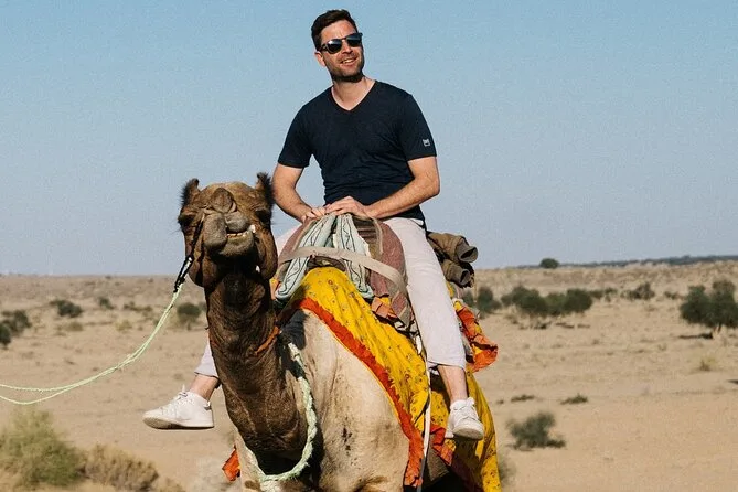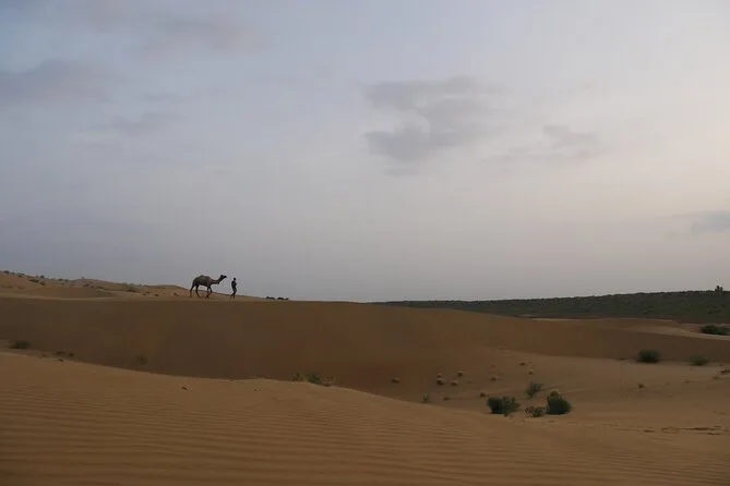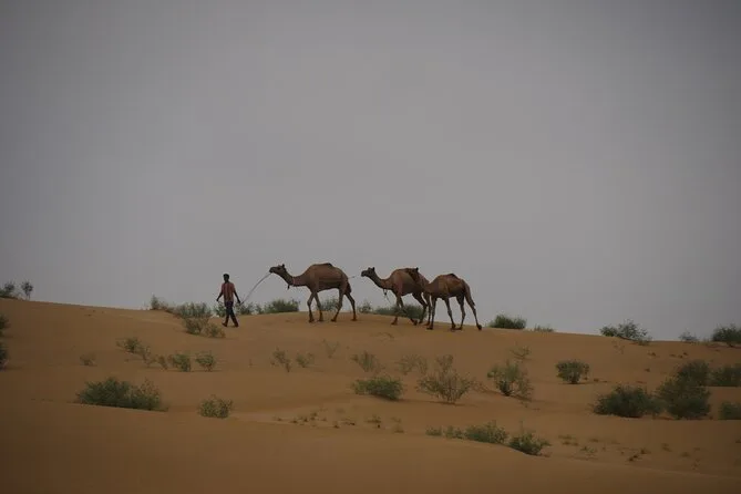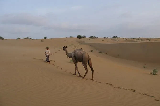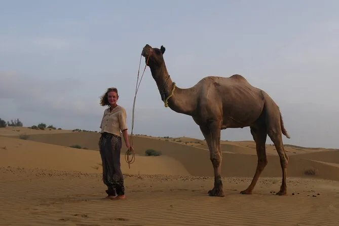 Tu experiencia incluye transporte ida y vuelta en jeep desde la ciudad de Jaisalmer hasta el borde del desierto, entradas al lago Jasery y al fuerte Khaba, tu propio camello para recorrer las dunas del desierto de Thar al atardecer con guías locales, té y snacks mientras disfrutas los colores del atardecer sobre las colinas de arena, cena vegetariana recién preparada sobre la fogata por tus anfitriones (con dal, arroz y chapati), agua embotellada durante todo el recorrido y desayuno — tostadas o gachas con chai caliente — antes de regresar a la ciudad a media mañana.
