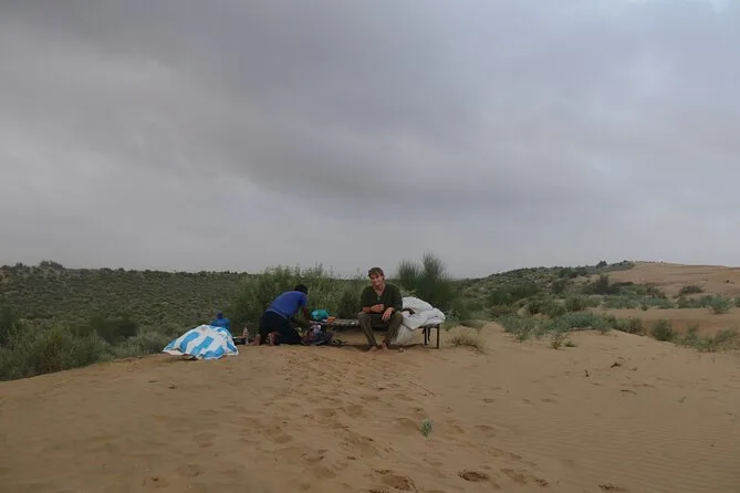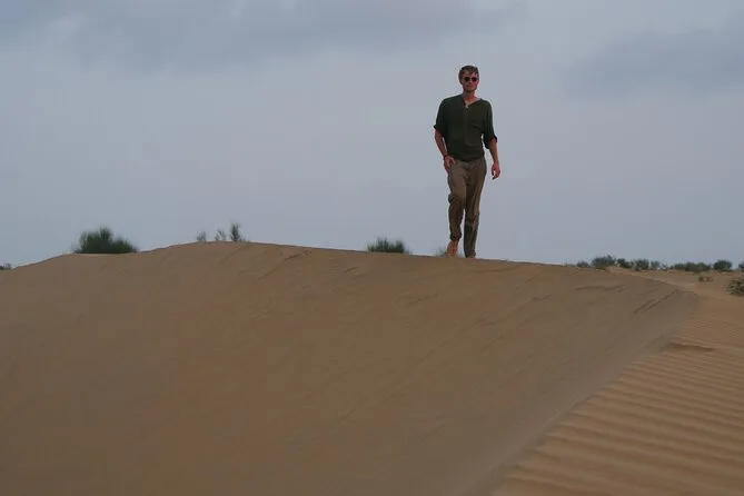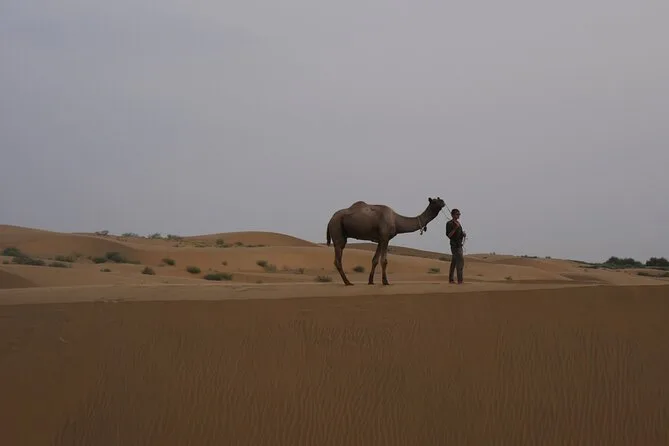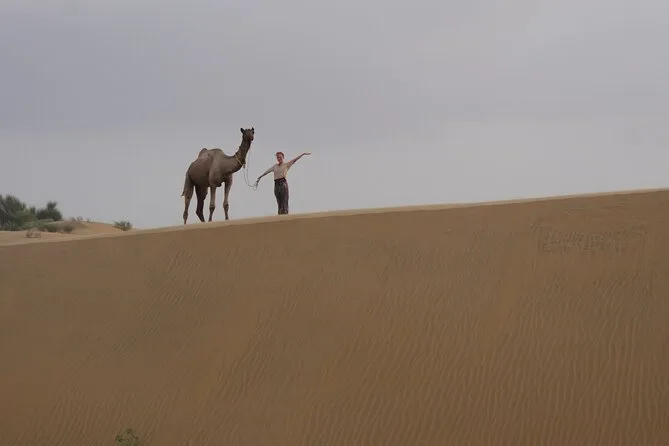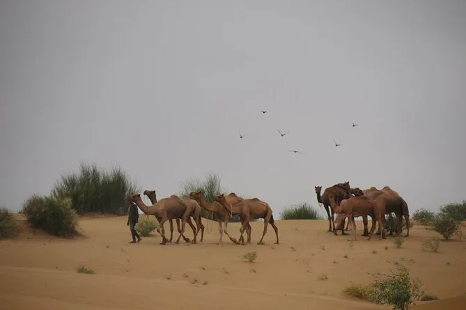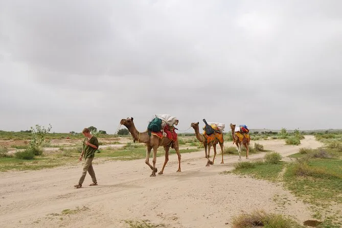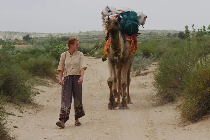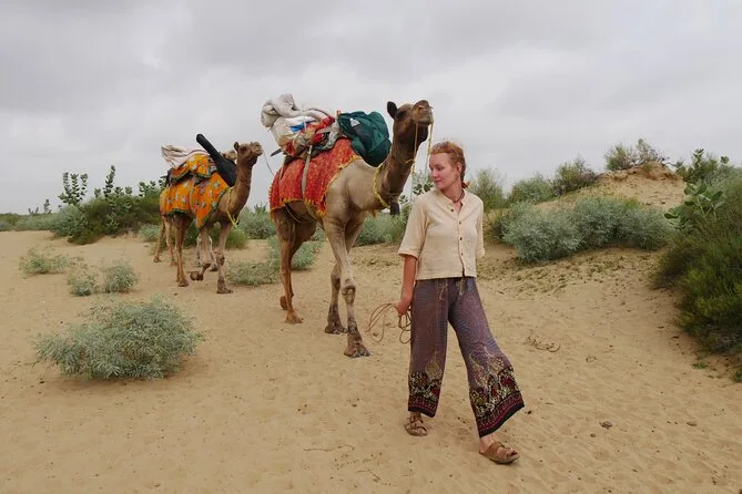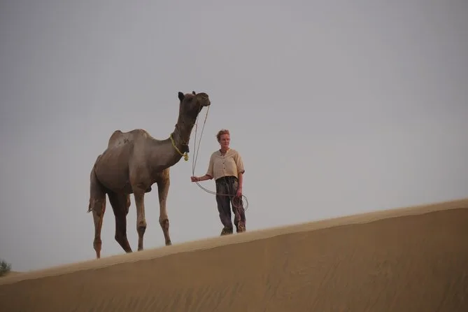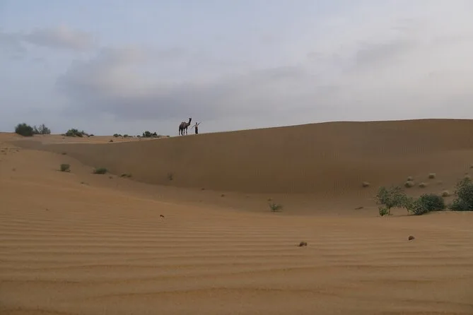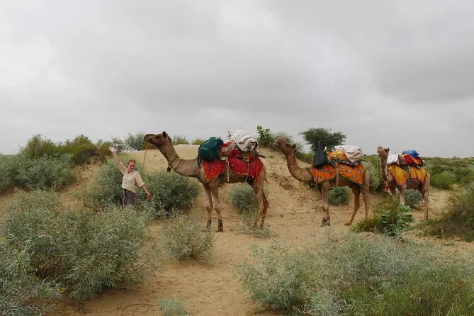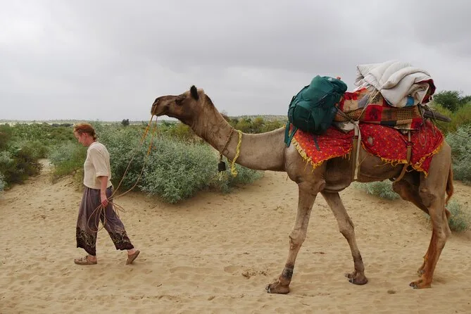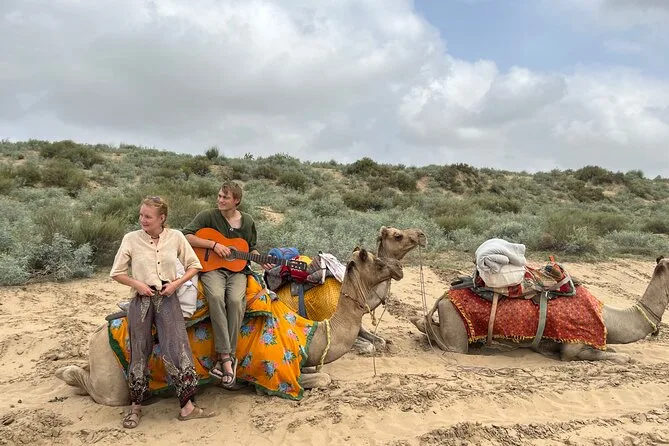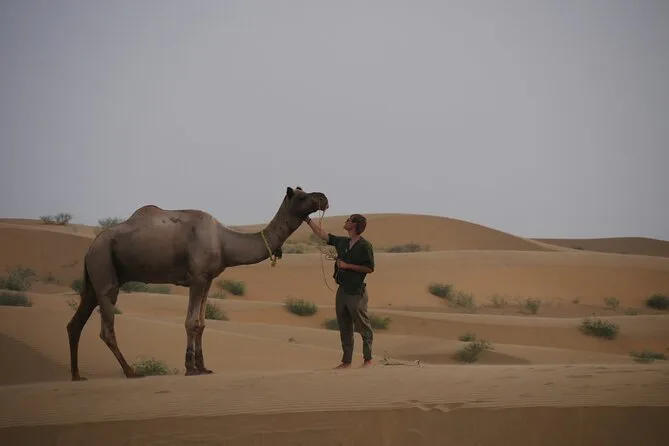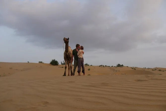 Conocerás guías locales en Jaisalmer antes de salir en jeep hacia el lago Jasery y el fuerte Khaba. Monta tu propio camello hasta las dunas del desierto de Thar para tomar té al atardecer y cenar junto al fuego con comida fresca preparada por tus anfitriones. Duerme bajo un cielo estrellado antes del desayuno y regresa a la ciudad — risas, momentos de calma y sabores auténticos del desierto te esperan.