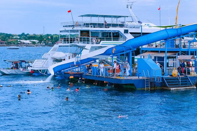 Tu día incluye traslado en vehículo con aire acondicionado desde tu hotel en Bali, té o café con pastas a bordo tras salir del puerto de Benoa, uso completo de equipo de snorkel con instrucciones si las necesitas, paseos ilimitados en banana boat entre 11 AM y 2 PM, acceso al tobogán de 35 metros y trampolín en el pontón de Nusa Lembongan. Disfrutarás de un almuerzo buffet internacional a bordo en un ambiente fresco antes de un tour guiado por el pueblo de Lembongan. Además, tendrás taquillas para tus cosas durante todo el día antes de regresar a Bali por la tarde.