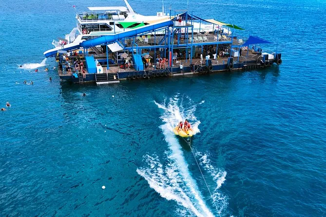 Disfruta de paseos ilimitados en banana boat (11 AM–2 PM), tobogán de 35 m, snorkel, cámara para ver corales, trampolín y más.
