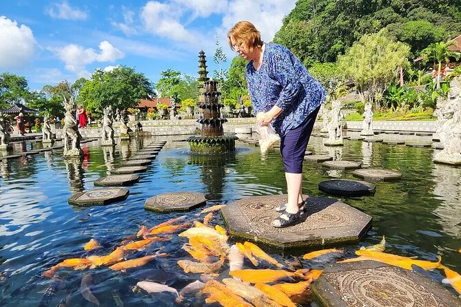 Después fuimos al Palacio de Agua Tirta Gangga. El lugar huele a piedra mojada y flores de frangipani, una mezcla extrañamente relajante. Había familias alimentando a los peces koi en los estanques — una niña pequeña se reía cada vez que los peces le mordisqueaban los dedos. Nuestro guía nos contó que el rey construyó este lugar para ceremonias espirituales; se entiende por qué la gente sigue viniendo solo para pasear o sentarse junto a las fuentes. Intenté cruzar las piedras flotantes (casi me resbalo una vez), pero la verdad es que es más tranquilo simplemente ver a los demás intentando no caer al agua.