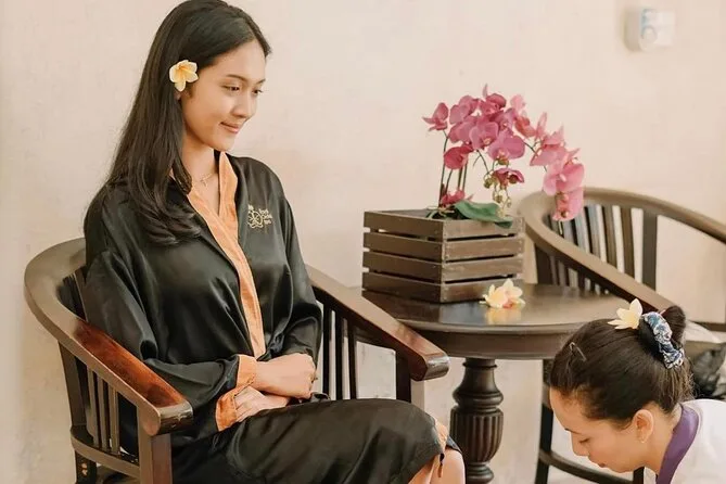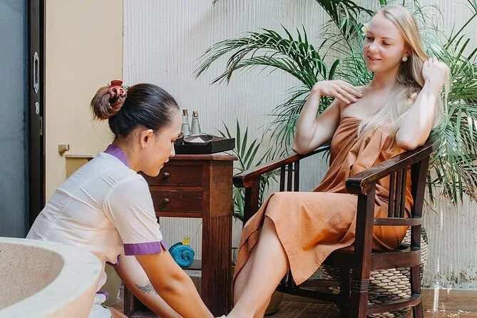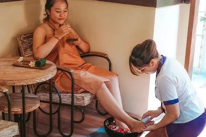 Tu experiencia incluye recogida gratuita en hotel desde zonas centrales como Seminyak o Kuta (para reservas de dos o más personas), todo el equipo del spa en el lugar, tés herbales o café al llegar, y una secuencia completa de tratamientos: lavado de pies con thalaso, masaje balinés de una hora con terapeutas locales, exfoliación corporal de treinta minutos seguida de hidratación con yogur, y finalmente un baño privado de flores para dos antes del regreso.