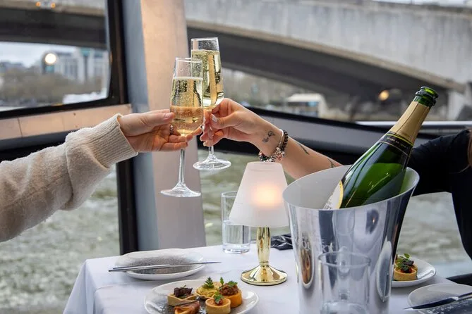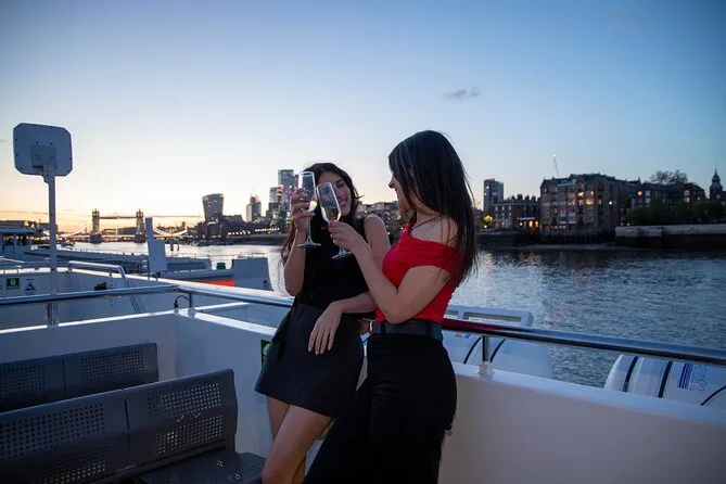 Tu noche incluye embarque en Westminster Pier con asiento garantizado junto a ventanas panorámicas (mejora VIP disponible), copa de bienvenida de vino espumoso o refresco antes de zarpar, un delicioso menú de tres platos (opción vegetariana bajo pedido), música en vivo con espacio para bailar hasta tarde y un servicio atento durante todo el recorrido de tres horas por el emblemático río Támesis de Londres.