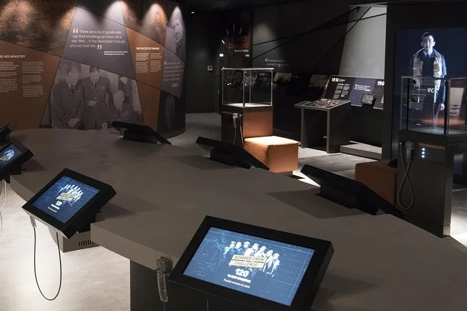 La exposición dentro fue mucho más envolvente de lo que imaginaba (y siendo sincero, no soy muy de museos). Voces por todas partes — no solo británicas; pilotos alemanes, mujeres que trabajaron en fábricas, incluso niños de esa época. Lo llaman la “Orquesta de Voces.” Una grabación me detuvo: una mujer describiendo el olor del pan cuando terminó el racionamiento. Curioso qué cosas se quedan grabadas. Nuestro guía (creo que se llamaba Alan) respondía a cada pregunta como si lo hubiera vivido en carne propia. Incluso se rió cuando alguien preguntó si había pilotado uno de esos bombarderos — “Soy viejo, pero no tanto.”
