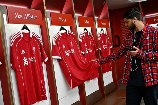 El vestuario local huele un poco a linimento y a ropa nueva — una mezcla curiosa. Casi podías imaginar a Salah o Van Dijk saliendo un momento. Dave nos contó historias sobre los rituales del día del partido; parece que uno del staff siempre coloca las botellas de agua exactamente igual. Me hizo gracia lo supersticiosa que es la gente. Nos sentamos en el asiento de Klopp en el banquillo (mi amigo intentó imitarlo — no muy bien), y luego subimos a The Kop. La vista de Liverpool desde ahí arriba es increíble, sobre todo con el viento golpeando las orejas.