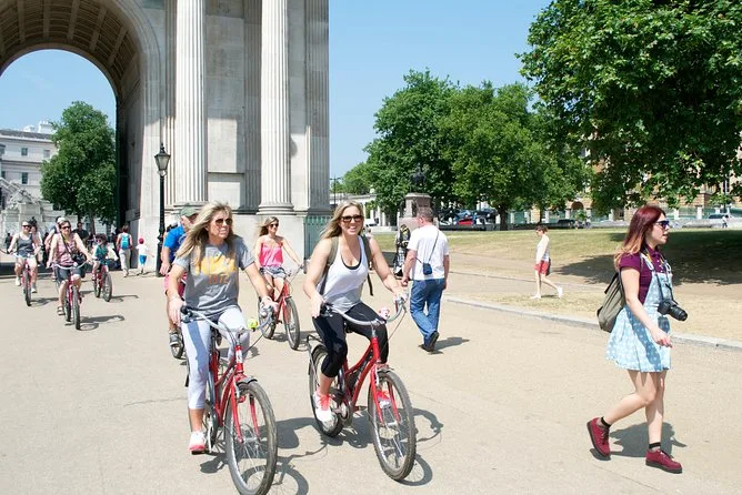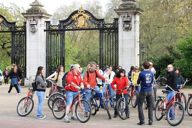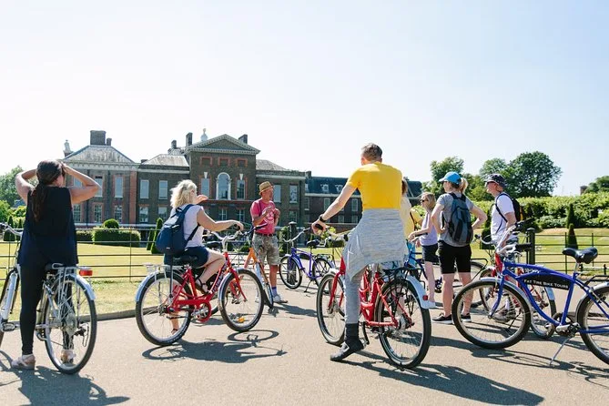 Tu día incluye el uso de una bicicleta estilo California beach cruiser (cada una con nombre de británicos famosos), alquiler de casco si lo deseas, la guía de un local experto que conoce mil historias sobre la vida en Londres—y muchas paradas para disfrutar parques, palacios y esos pequeños momentos callejeros que de otra forma pasarías por alto.