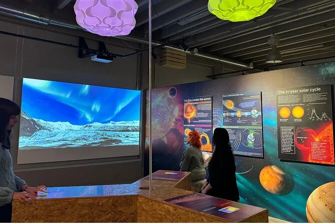 Tu día incluye entrada a Aurora Reykjavík con acceso a todas las exhibiciones multimedia, mitos de culturas árticas, proyección de película en 4K de auroras, actividades científicas interactivas, uso del primer casco VR de auroras del mundo y consejos expertos para que aprendas a ver o fotografiar la aurora antes de irte.