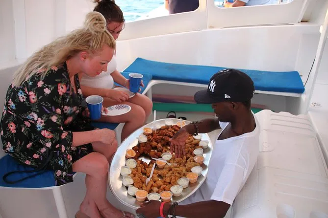 El barco avanzaba despacio bordeando Providenciales mientras sonaba música — no muy alta, justo para llenar los silencios entre charlas. Alguien señaló un pequeño cay lejano; Jules dijo que nadie vive allí, salvo algunas aves tercas. La tripulación pasó bandejas con bocados de un local cercano — probé algo con caracola y tuve que preguntar qué era (la respuesta: “¡solo pruébalo!”). El sabor era fresco y un poco picante, perfecto con el ponche de ron frío que seguían sirviendo. De vez en cuando alguien reía fuerte o intentaba hacerse un selfie contra el viento — ese ambiente relajado que solo un crucero solo para adultos puede ofrecer.