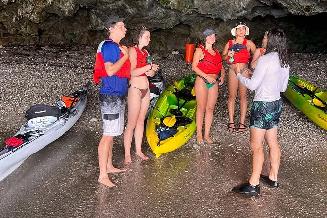 Tu día incluye kayaks cómodos con asientos ajustables, palas, chalecos salvavidas, bolsas estancas para tus cosas y equipo de snorkel si quieres explorar bajo el agua. También hay agua embotellada y fruta fresca durante la parada en la playa, vestuarios y baños en la base para antes o después de remar, y tu guía te enviará las fotos para que no tengas que preocuparte por mojar tu móvil.