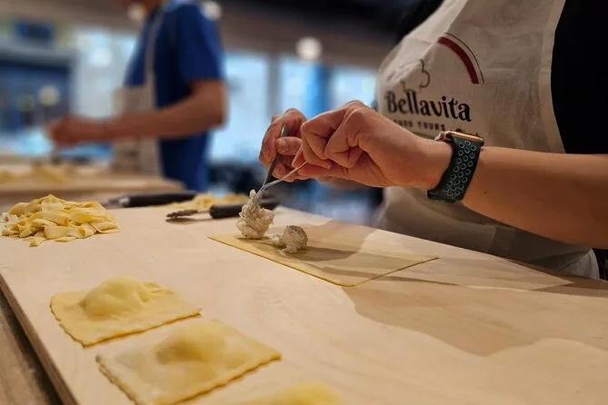 Empezamos con la masa para fettuccine. Amasarla requirió más fuerza de la que esperaba — mis manos quedaron pegajosas y había harina por todos lados, incluso en mi camisa (intenté quitarla pero me rendí). Marco nos enseñó a estirar la masa hasta dejarla casi transparente. Tenía una forma de explicar que hacía que todo pareciera menos una clase y más como estar en la cocina de un amigo. Al lado había una pareja de Londres que se reía cada vez que sus fideos se pegaban. Creo que todos conectamos con nuestros raviolis de formas extrañas.