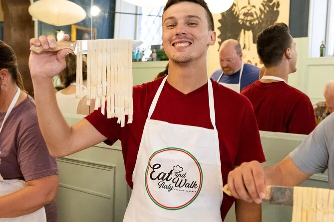 Tu experiencia incluye todos los ingredientes para hacer fettuccine frescos con salsa a elección entre Amatriciana, Cacio e Pepe o Tomate y Albahaca; guía práctica de un chef local; tiramisú casero; una copa de vino o refresco; agua durante toda la actividad; y para terminar, limoncello o café espresso—todo en el centro de Roma antes de volver a la ciudad.