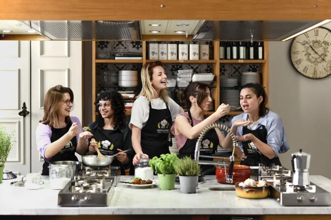 Antes de que pudiera dejar mi bolso, ya me habían servido una copa fría de Prosecco — así empezó esta clase de pizza y gelato en Roma. La cocina del palacio parecía más la de una casa que una escuela, con la luz del sol reflejándose en los azulejos antiguos y el aroma a harina en el aire. Nuestro chef, Marco, sonrió y nos llamó a la gran mesa de madera. Cambiaba entre inglés e italiano con tanta naturalidad que me dieron ganas de haber prestado más en las clases de idiomas. Hubo un momento en que me puso las manos sobre la masa — “así, ¿ves?” — y de repente estaba amasando pizza de verdad, no solo mirando vídeos en YouTube desde casa.