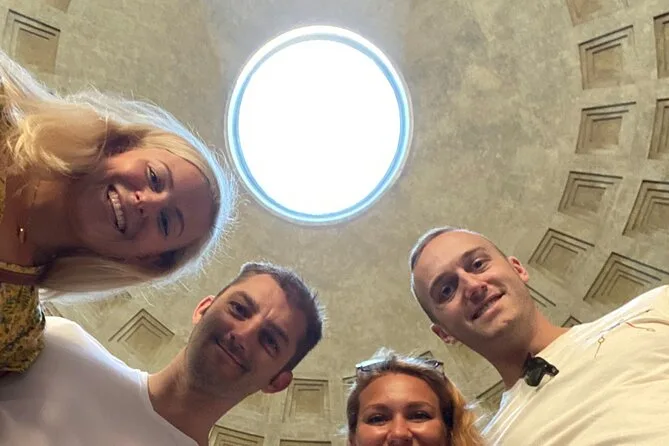 De hecho, llegué un poco tarde porque me distraje con un músico callejero en la Piazza della Rotonda — ya sabes cómo es Roma, siempre hay algo que te roba la atención. Nuestro grupo ya se estaba reuniendo cerca de las columnas cuando llegué, un poco sin aliento y esperando que nadie se diera cuenta. La guía (Giulia) simplemente sonrió y me hizo señas para que me acercara, sin problema. Tenía una forma de hablar del Panteón que lo hacía sentir menos como un monumento y más como un viejo amigo que quería que conociéramos.